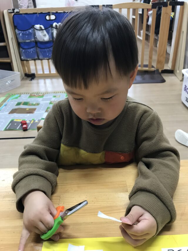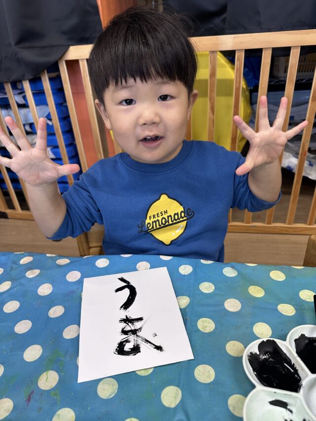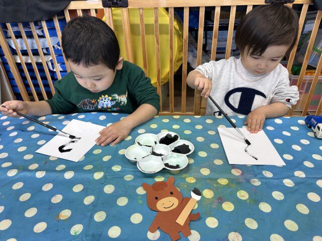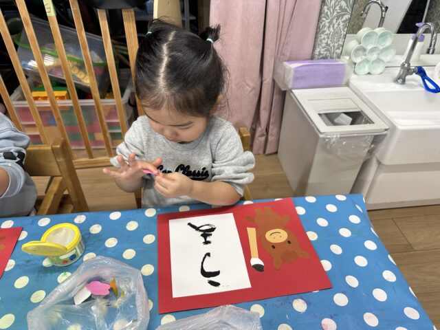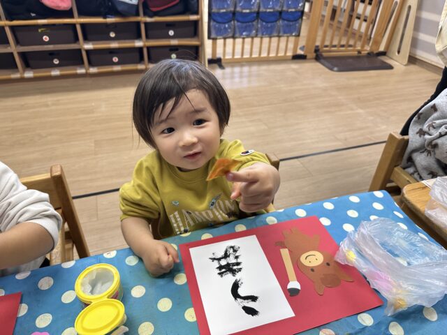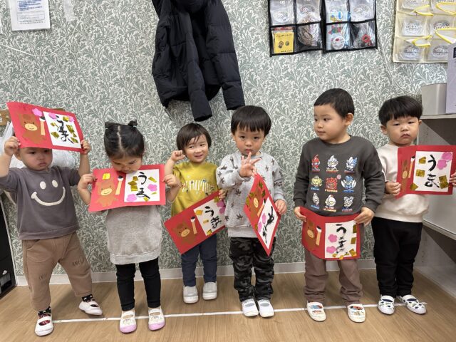 2026.01.9 保育園の日常、誉田保育園 「できたー!!」2歳児♪ 新年を迎え、保育園の玄関にもお正月飾りが♡ 記念に「ハイチーズ!」 お正月といえば、書初め!今年の干支は・・・・? 「うまー!!」とても上手に書けました! 新年、新しいことにもチャレンジ!! はさみに挑戦です!「ドキドキするなぁ・・・」 はさみも紙も、しっかり持ってチョキン♪ 切った折り紙をのりで貼ります!「のりは少しだけ取るんだよね!」 「見てー!のり付けられたよ~!」 「できた~!」素敵な作品が完成しました♡今年も色々なことにチャレンジしようね!
