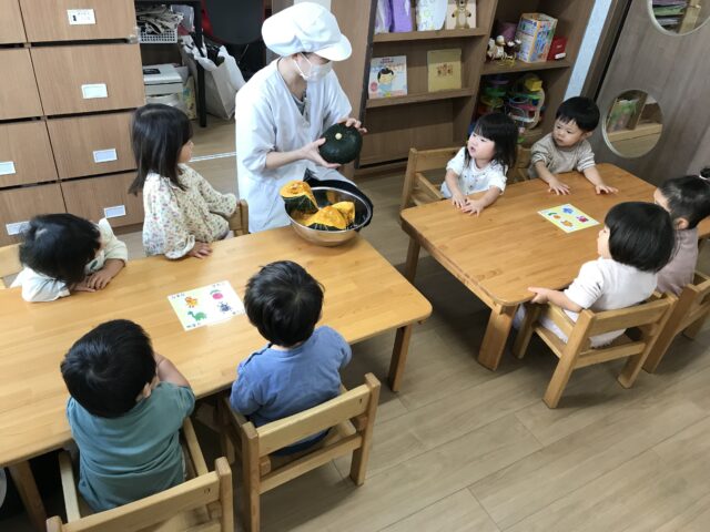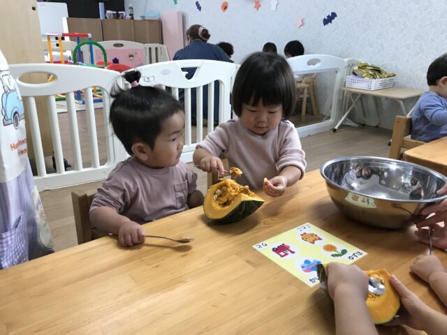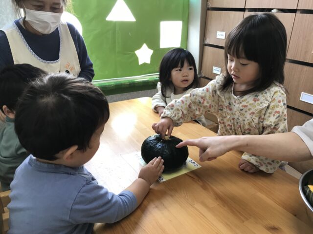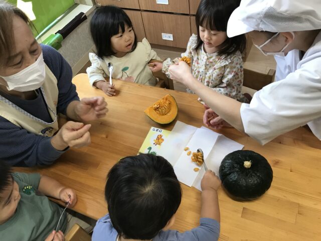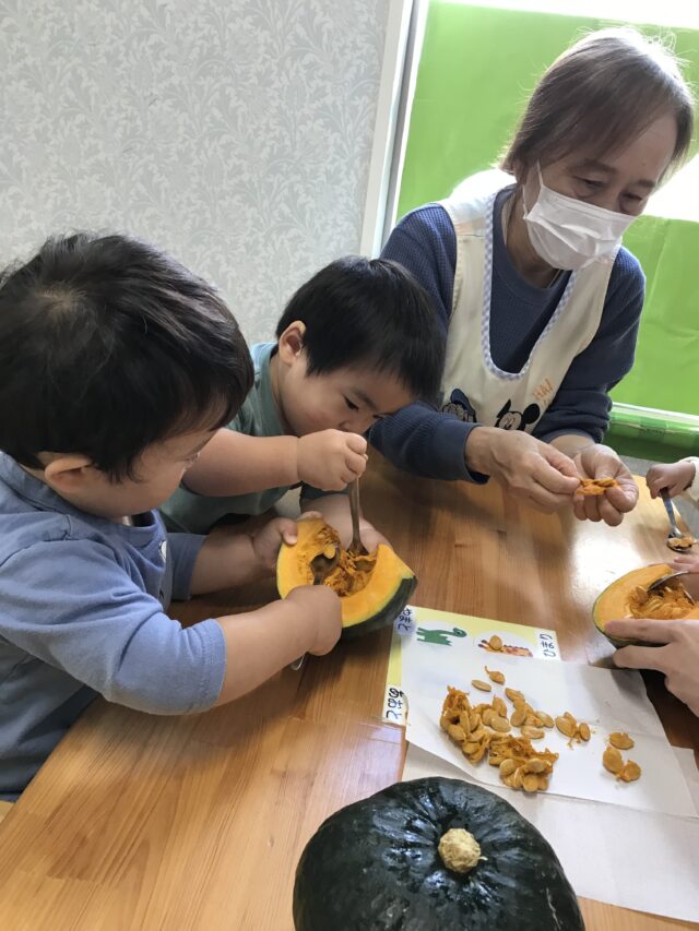 2025.11.8 保育園の日常、誉田保育園 かぼちゃのたねとり♪1歳児♪ これから何が始まるのかな・・・わくわく♡ 手で触ってみよう♪「つんつん」「つめたい~」「かたいね・・・」 カットされたかぼちゃの種をとってみよう♪「みて~いっぱいとれたよ~」 「ううう~かたいなあ・・・」「わたしも か~し~て~」 うわあ♪ たねがいっぱい♡ ヌルヌルしてて手が黄色になっちゃうね・・・ とれた種は給食の先生に洗ってもらいました。乾いたら容器に入れてマラカスもできるね♡