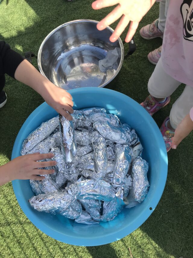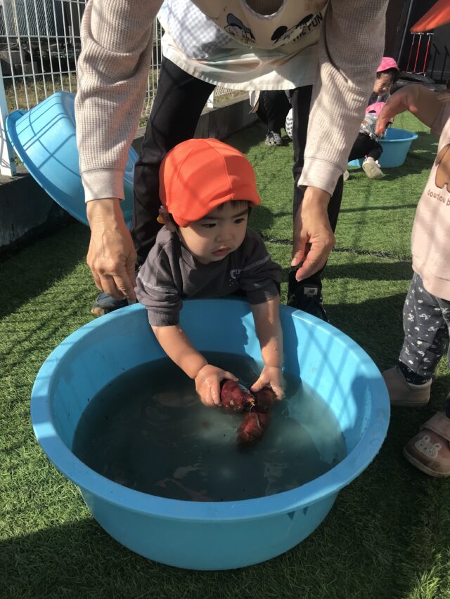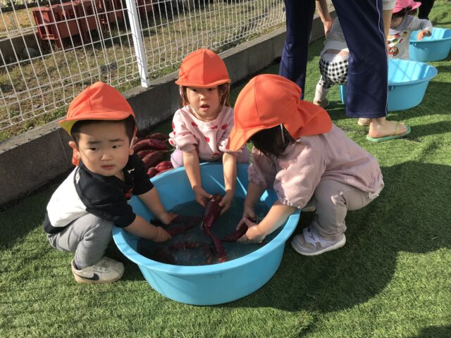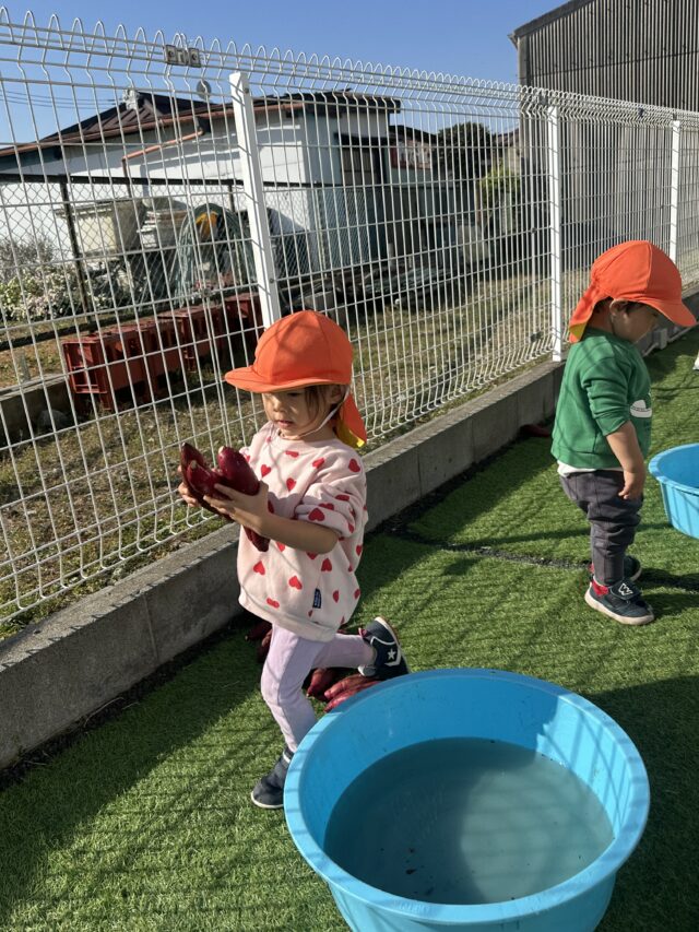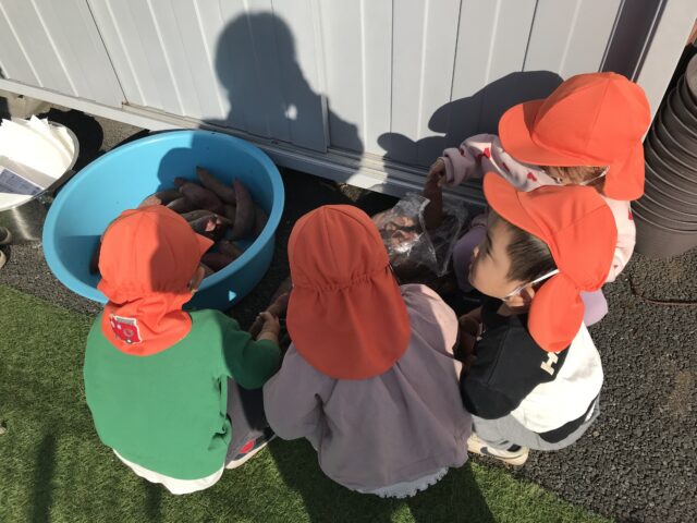 2025.11.29 保育園の日常、誉田保育園 さつまいも洗ったよ!1歳児 5歳児が芋ほりに行ったサツマイモをきれいに洗います!「おいもがいっぱーい♪」 ゴシゴシ♪ きれいになあれ♪ みんなで洗ってくれたお芋は、今度はお兄さん、お姉さんにバトンタッチ♪ みんなで洗ったお芋は、お兄さん、お姉さんがアルミホイルで巻いてもらいました♪焼き芋会では美味しい焼き芋になるね♪ みんなお手伝いありがとうね♪