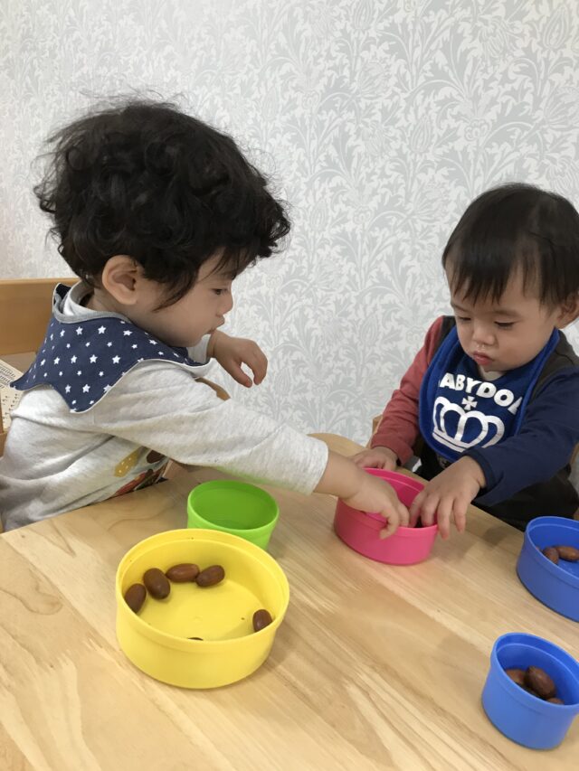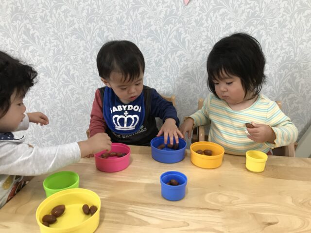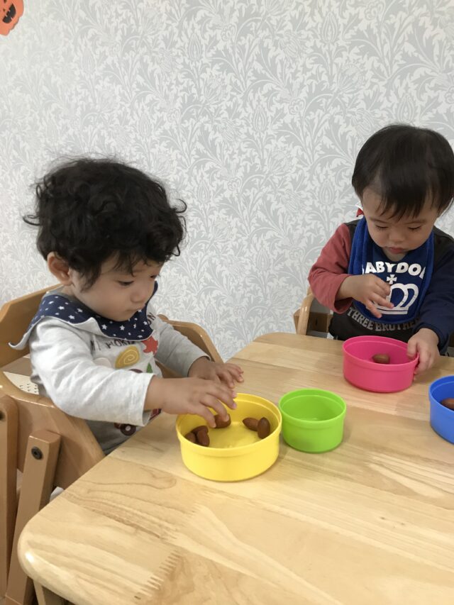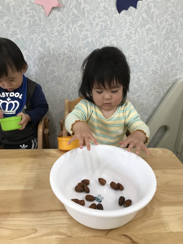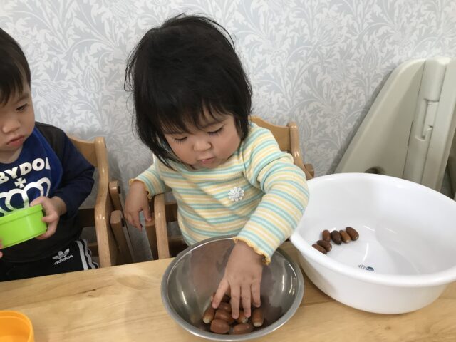 2025.11.8 保育園の日常、誉田保育園 どんぐり遊び♪0歳児♪ 公園にたくさんのどんぐりが落ちていました♪ いつのまにか秋ですね♪ どんぐりを使って大好きな「入れ替え」を楽しんでる様子を紹介しますね♪ どんぐりころころ♪どんぶりこ~♪ 黄色から青へ 青から赤へ♪ 小さい指でつまんで入れ替えを楽しみます♪ 「これどうぞ♪」「くれるの?ありがとう♡」 大きいタライを用意すると「ザザザ~」・・・ 容器をひっくり返したり楽しそう♪ ステンレスに変えてみると・・・ 「あれれ 音が変わったね!」大発見♪指先を使ったり、音を楽しんだり、どんぐり遊びっておもしろいね♡