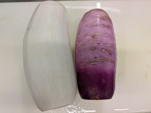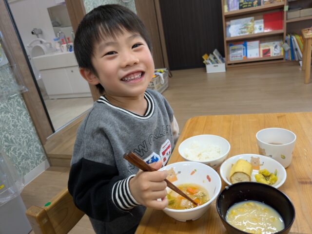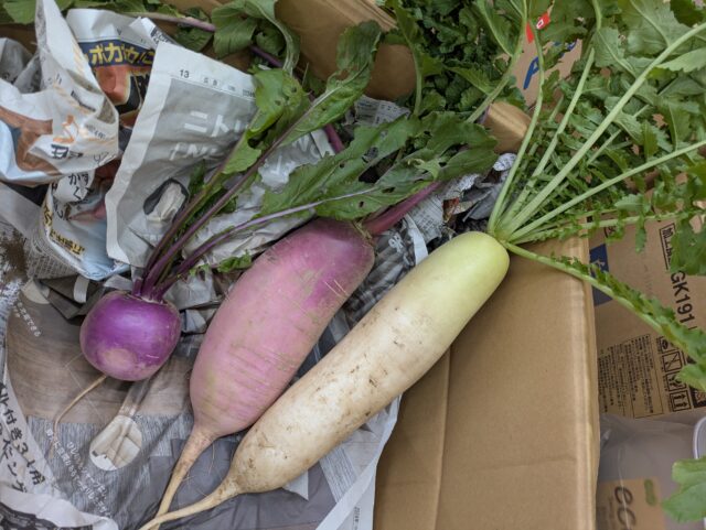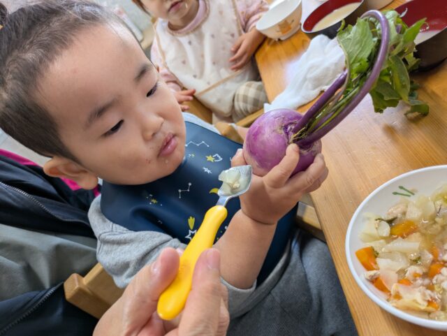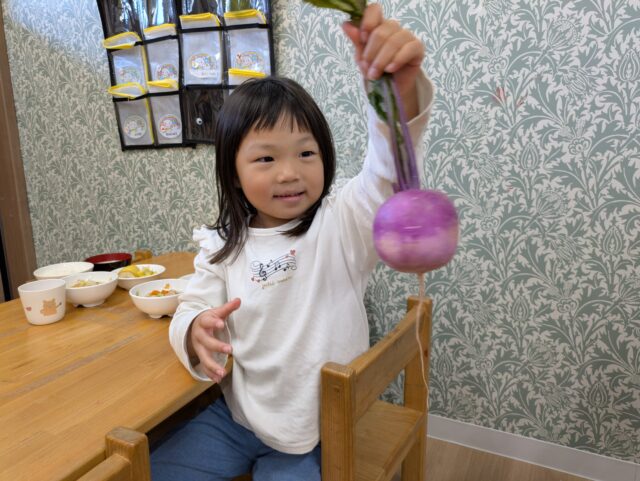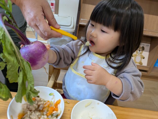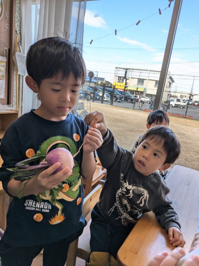 2025.11.23 保育園の日常、誉田保育園 ガバレ農場から新鮮な冬野菜が届きました♪ 白い大根は「冬自慢」ピンクの大根は「あやめ娘」赤色のかぶは「あやめ雪」という品種です♪ みんな普段、見かけない色のついた野菜に興味津々♪ 「おひげが長いね!」 「見てー葉っぱもすごくながいよー」 「どんな匂いがするかな・・・♪」 ピンクの大根の皮を剝いてみると・・・中は真っ白!!きめ細かくて、みずみずしくて、とっても美味しそう♪ 冬野菜たっぷりの「ポトフ」が出来上がりました♪ この赤い冬野菜が、白に変身するんだぁ~♪ 「わたしも一口、食べてみよう♪」 「すごく美味しかったよ♪また作ってね!」 新鮮な冬野菜に大満足な子どもたちでした!