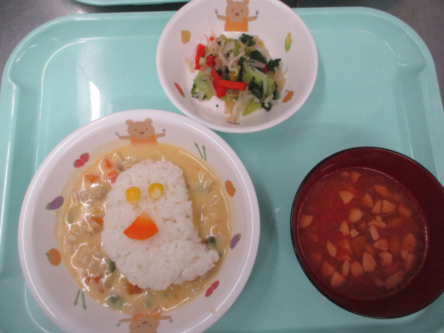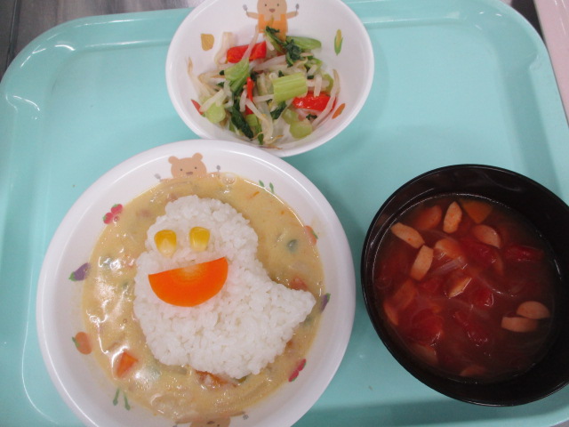 2025.11.10 保育園の日常、南流山認定こども園 ハロウィン献立 10月31日は、ハロウィン献立でした! お昼の給食は、 ・おばけごはん ・パンプキンシチュー ・彩りサラダ ・トマトスープ となっていました。 笑っているおばけや・・・ 少し困った表情のおばけ・・・ 「わあ、おばけだ!」と喜んでいるこども達でした。 また、おやつはかぼちゃプリンでした。