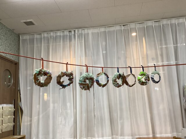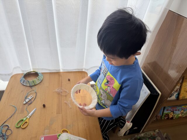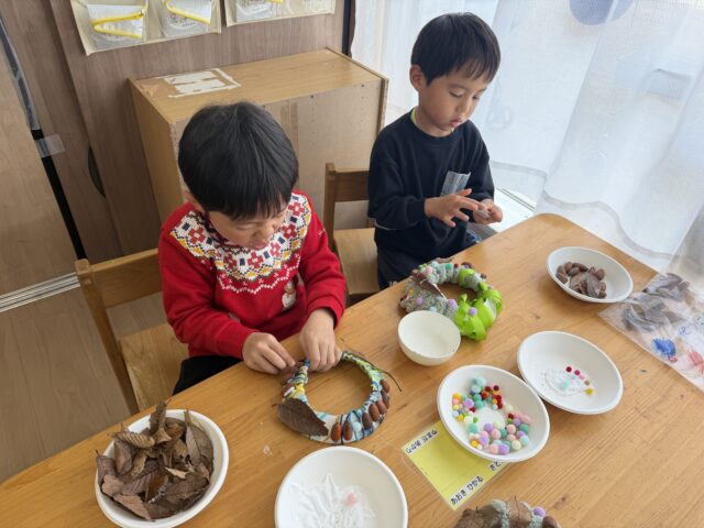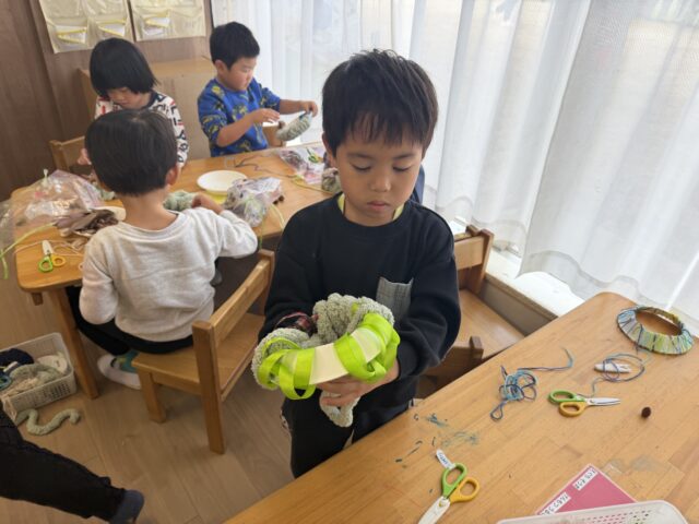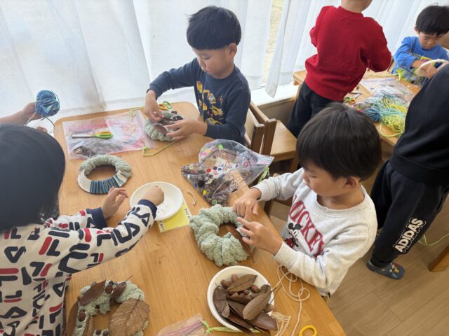 2025.11.15 保育園の日常、誉田保育園 リース製作♪4歳児♪ 紙皿に ぐるぐる紐を巻くのに挑戦♪ううう難しい~・・・ 拾ってきた葉っぱや、どんぐりを飾ってみることにも挑戦♪ どこに貼ろうかな・・・♪あっ!この どんぐり小さくて可愛いね♪ 一足早いクリスマスを感じ、一人一人個性の光るリースになりました♪