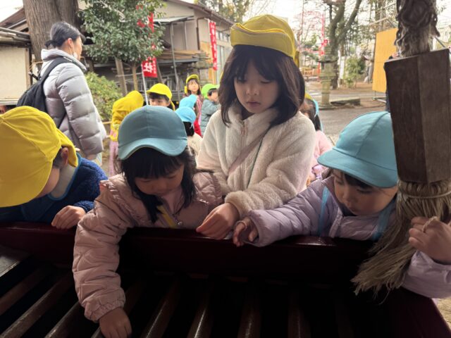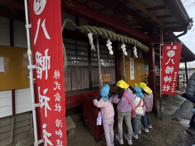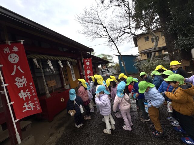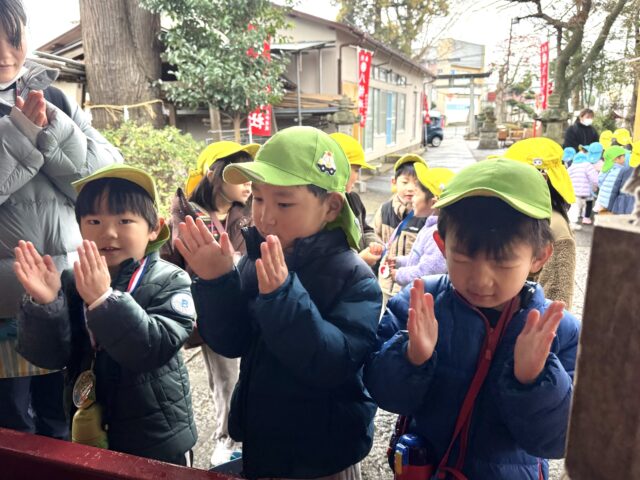 2026.01.9 保育園の日常、誉田保育園 初詣に行きました♪以上児♪ 1月7日 楽しみにしていた初詣♪雨がポツンと降っていましたが、みんなの元気パワーで無事に神社に到着することができました! 「八幡神社」に到着~!お家から5円玉とお財布を持って、上手に歩いてくることができました! お賽銭をして・・・お友だちと一緒に鈴を鳴らしてみるよ♪ しっかり手をたたいて、お願い事を伝える子どもたち♪ みんなは何をお願いしたのかな・・・♪ とても上手に参拝をすることができ、子どもたちの成長を感じることができました♪2026年も元気で笑顔いっぱい楽しく過ごせますように♡