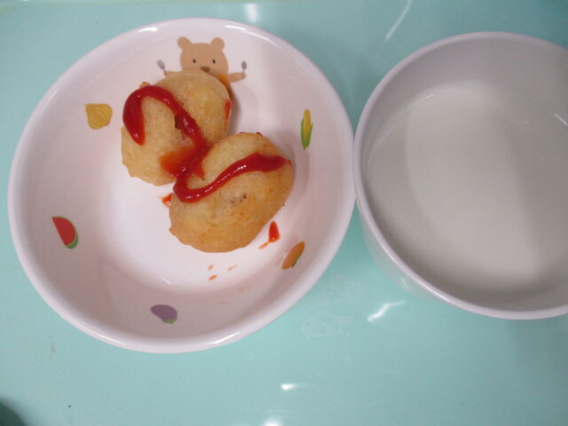 2025.12.10 ある日の給食 東葛西園 おやつ アメリカンドッグ、牛乳 おかわりもあっという間になくなるほど大人気でした。甘い衣としょっぱいソーセージ、酸味のあるケチャップで、みんなが大好きなメニューのようです。レシピを玄関に置いてあるので、ぜひご家庭でも作ってみてください!