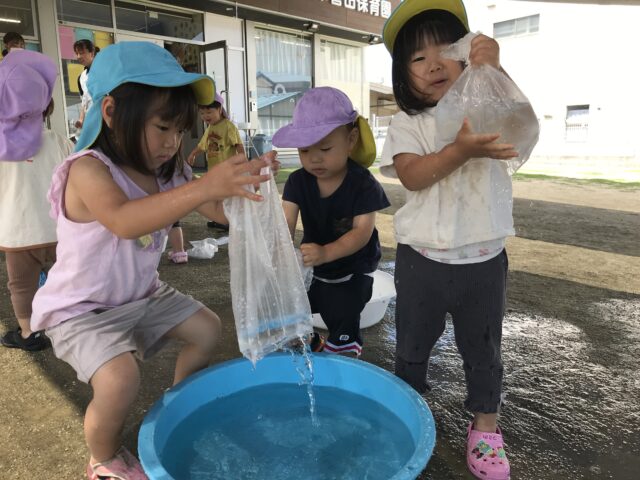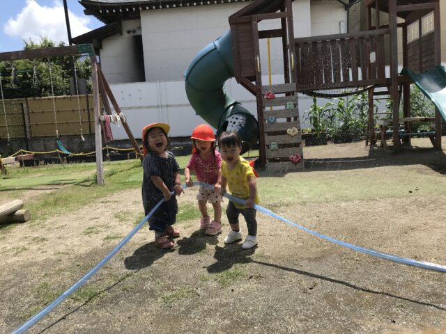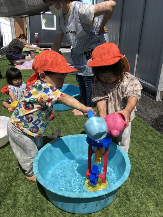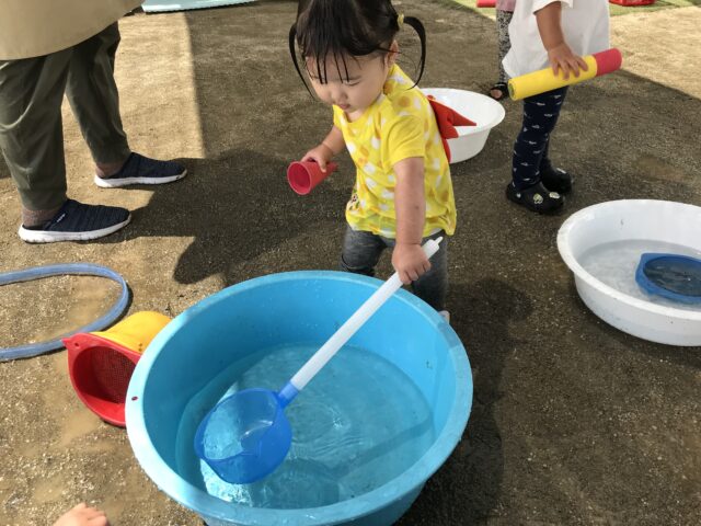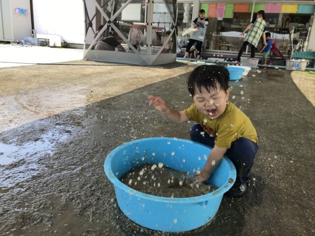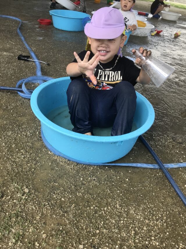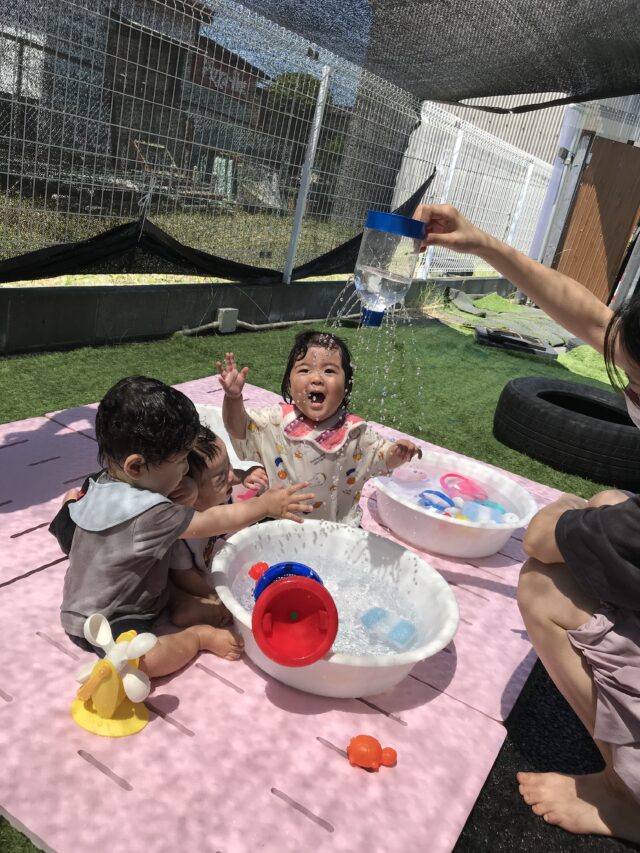 2025.06.22 保育園の日常、誉田保育園 水遊び☆未満児 水が心地よい季節になりました。爽快な笑顔で水に親しむ子ども達です 0歳児 水しぶきが顔にかかっても平気です。クルクル水車がお気に入りです 1歳児 ここに水を入れるとクルクル回るんだね~と色々試してあそんでいました 穴あきホースから水が噴き出ています。「濡れても平気~みんなで運ぼう~」全身びしょぬれでした 水をすくっては、隣のタライに移して~何度も楽しんでいました。お料理している気分なのかな? 2歳児 豪快にダイビング!!タライの水がすぐ無くなってしまいます。 砂場の砂を混ぜ合わせて、コーヒーができました!! 3歳児 ビニール袋ですくってみよう。たくさんお水が入ったね。