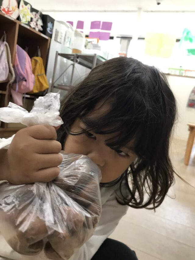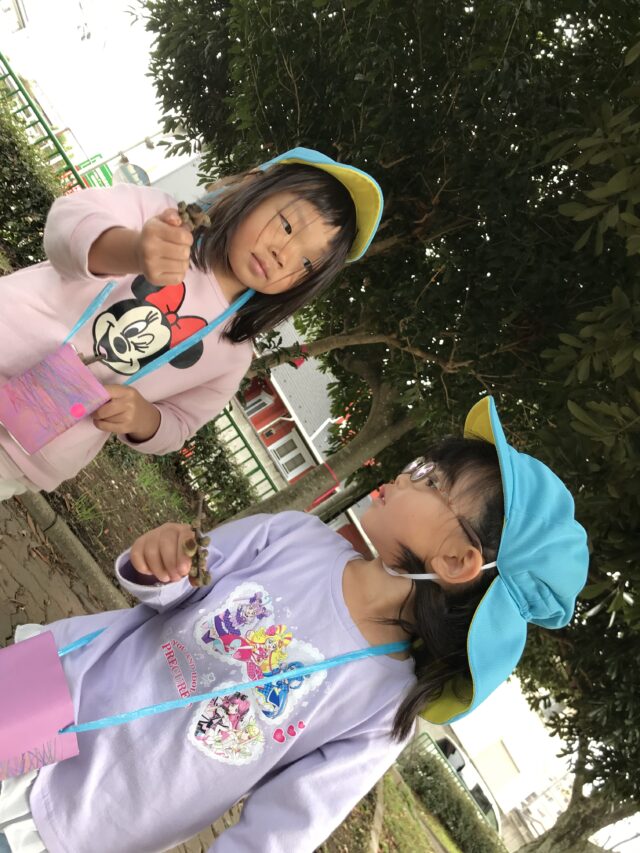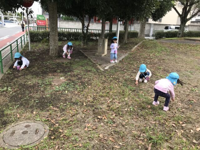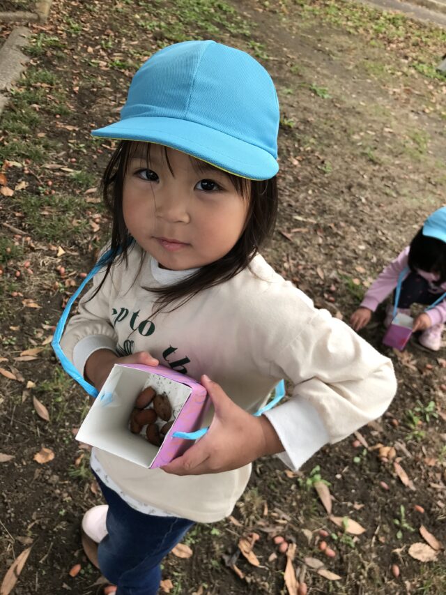 2025.11.8 保育園の日常、誉田保育園 自然を感じよう♪3歳児♪ 気温も涼しくなり散歩がしやすい季節になりました♪たくさんの自然を感じて楽しむ子どもたちです♡ たくさんのどんぐりに興味津々♡ 「みてみて~ どんぐりのぼうしみたい♡」 お友だちと見せ合い楽しんでいます! 「お家に持って帰る♡」と言いながら、手作りバックにいっぱいどんぐりだね♪ 「どんぐりの中には何が入ってるの?」と疑問をもつ子も♪ 角にどんぐりを打って、割れるか試しています♪ 「いっぱい集めたよ~♪」と保育園に帰って見せてくれました♪ たくさんのどんぐりを使って遊んでみようね♡