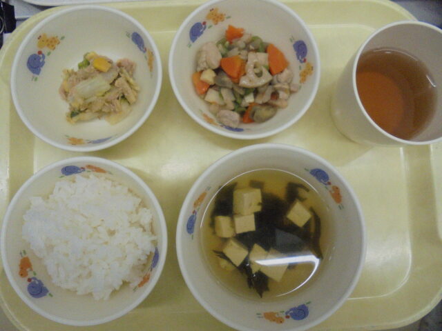 御飯、筑前煮、白菜とツナのごま和え、豆腐のすまし汁