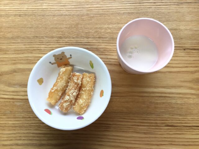 2025.11.6 ある日の給食 蓮沼園 おやつ チュロス 蓮沼園の子ども達は毎月の献立をとても楽しみにしています。待ちに待ったチュロスの日がやってきました!外側がカリカリの米粉のチュロスは大人気のメニューです。