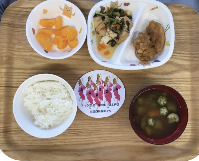 ごはん、佐那河内から揚げ(徳島)、小松菜のけんちゃん(香川)、宗田節の夏野菜味噌汁(高知)、みかん缶