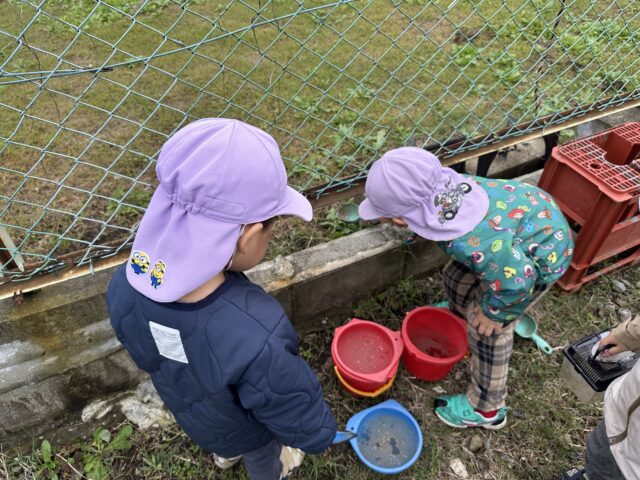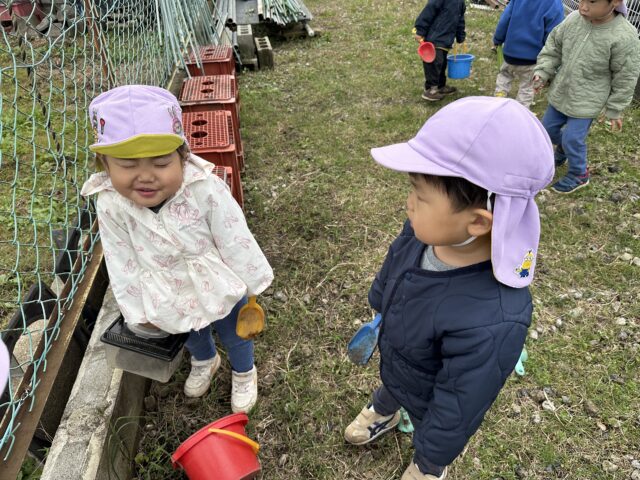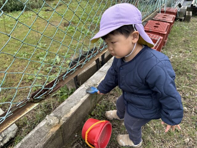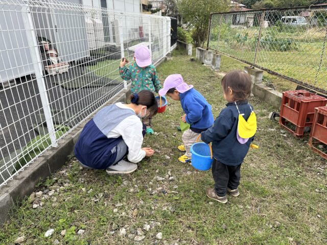 2025.11.8 保育園の日常、誉田保育園 虫探し隊♪ 2歳児♪ 砂場に大きなクモを発見♡ 「せんせー とってー」 捕まえたクモを虫かごへ♪ 「でっかーい♪」「ぼくにも見せて~」と大興奮♪ 虫探しに裏庭へ♪ 「せんせーバッタいたよ♪」「ぼくのバケツに入れて~♪」 またまた大きなクモを発見♡ 捕まえたいけど、ちょっぴこ、怖い・・・ 「わたしもこわくて捕まえられない・・・」「え~ど、どうする・・・?」 「僕が捕まえてあげる♡」「わーい!ありがとう♡」虫を捕まえるのが得意なお友だちの登場で一件落着♡ 「みてー捕まえられたよー♪」 捕まえることができて嬉しそうな様子♡ 友情も芽生えた虫探しになりました♡