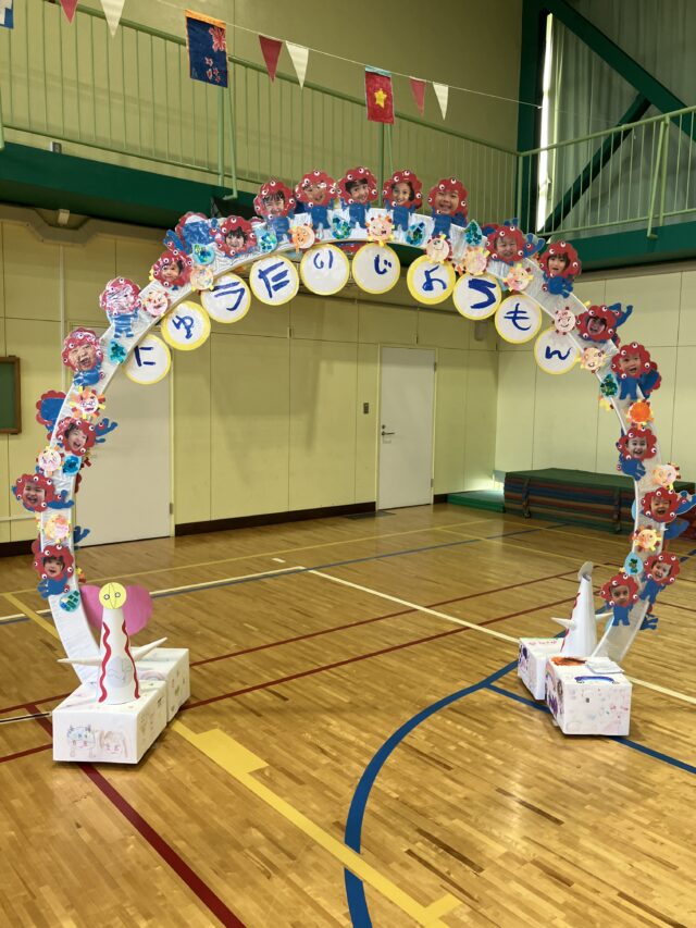 2025.11.7 保育園の日常、蒲田園 運動会 キッズラボ蒲田園の運動会 今年の子どもたちと考えたテーマは「にこにこ笑顔でエイエイオー」です。 入場門で使用したみゃくみゃくです。みんなの笑顔がたくさん見られた運動会でした。