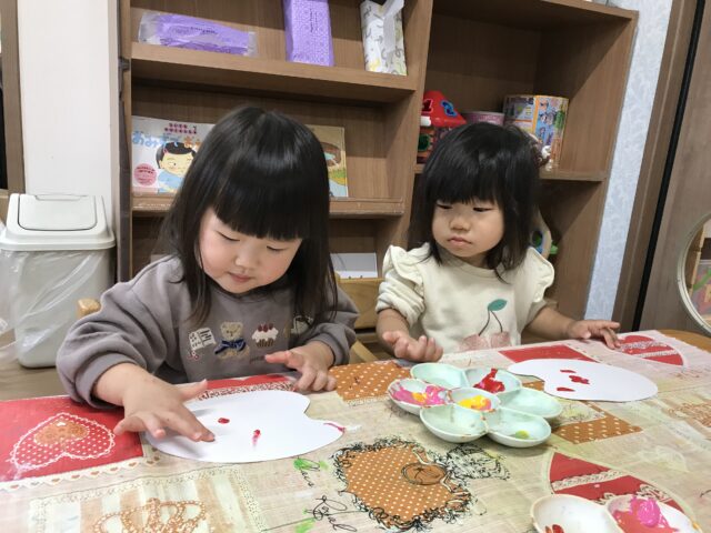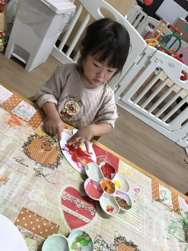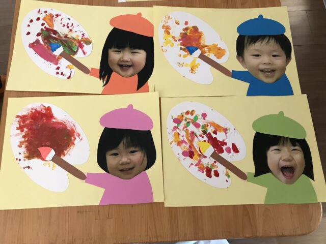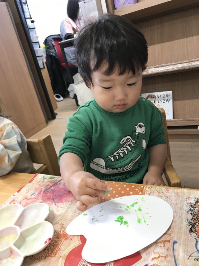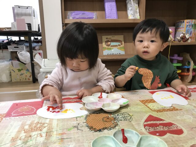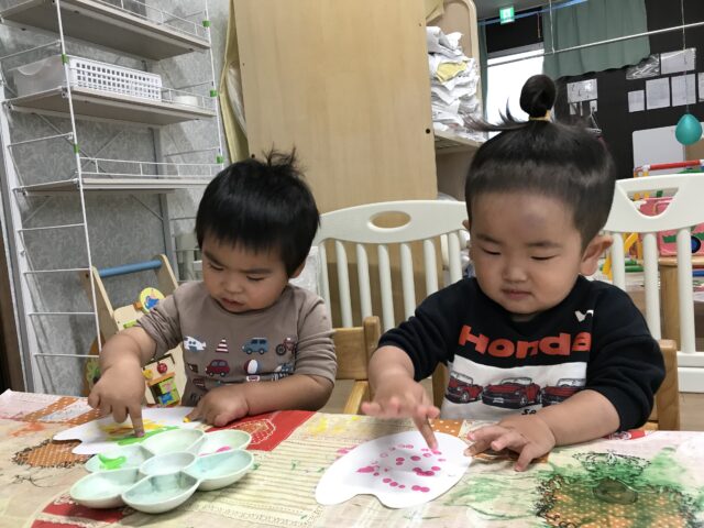 2025.11.23 保育園の日常、誉田保育園 1歳児の芸術の秋♪ 絵の具を使ってスタンプ! どんな模様ができるかな・・・♪ ポンポン! 楽しいね! 手の中を使って上手にできているね♪ かわいい♡ベレー帽をかぶった子どもたち♪みんな素敵な笑顔♡