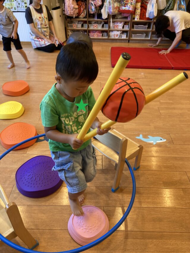 ボードに乗せたり、バトンに挟んだりしてボールを落とさないように運びつつ・・・・