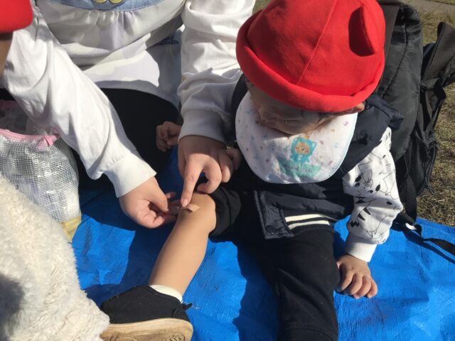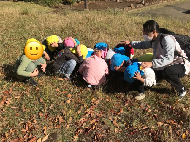 2025.11.14 保育園の日常、西葛西園 ⚠️戸外活動中の避難訓練⛑️ 今日の避難訓練は、公園で地震があった想定で行いました! みんな落ち着いて上手にできました👍 もも組(0歳児)さん、落ち着いてできました! 怪我をした設定で、応急処置の練習もしました! 幼児組さんは、上手にダンゴムシのポーズで頭を守ってました!