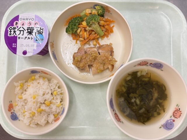 とうもろこし御飯、鶏肉のねぎ塩だれ、ブロッコリーのごま和え、あさりのすまし汁、ヨーグルト