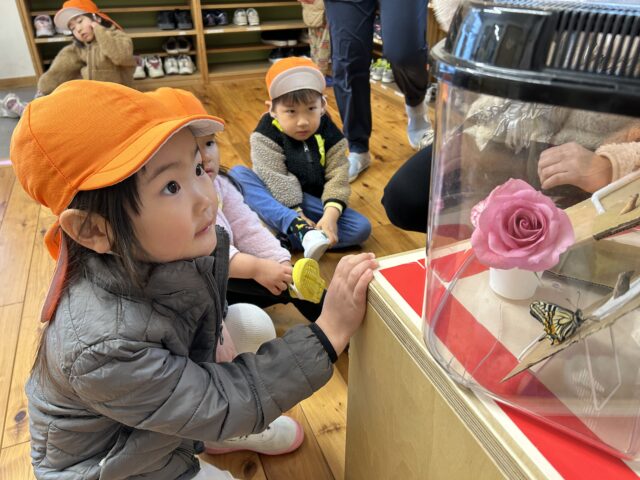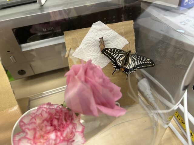 (続きです) 子どもたちが元気に登園してくる中、事務所のカゴの中でついに「その時」がやってきました。ゆっくりと殻を脱ぎ捨て、黒く鮮やかな羽を広げ始めたアゲハチョウ。