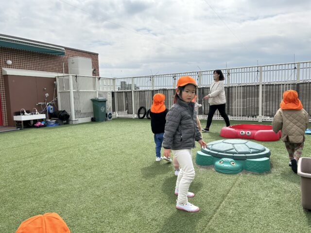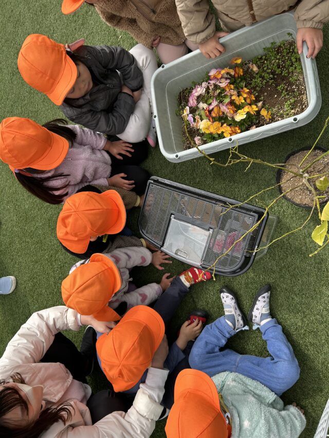 ちょうど散歩から戻ってきたころには羽もしっかりと乾いていたので、屋上園庭で「いってらっしゃい!」と放しました。春の青空へ高く、高く舞い上がる姿に、子どもたちからは歓声が上がります。まるで卒園したお兄さん・お姉さんの門出を祝っているかのようでした。