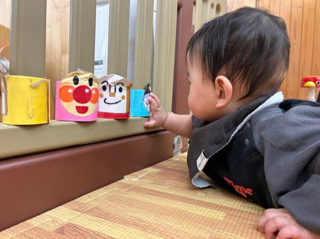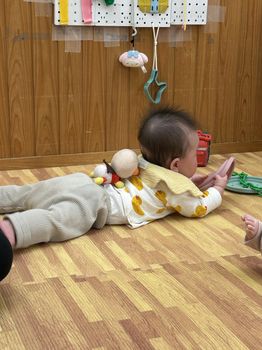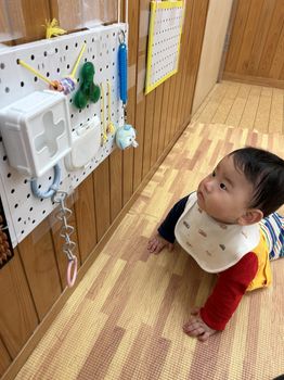 2026.04.8 保育園の日常、菊名園 あそびはまなび! いろいろな遊びに興味津々の慣れ保育中のひよこ組さん。 見て、触れて、遊んでいます~! これは、なんだ~??? 背中にお友だち乗ってます~!気にせずおてての感触味わってます~! 触れてみた! こちらは、触れたら音が出たよ~♪夢中になってます~✨