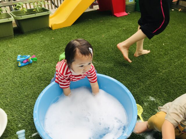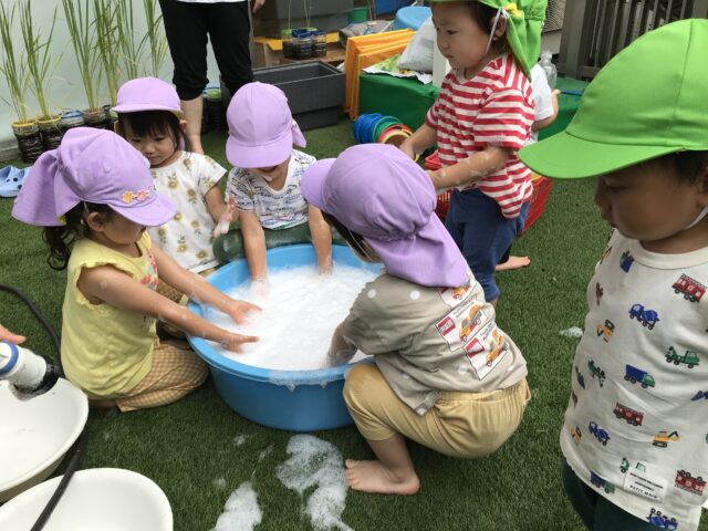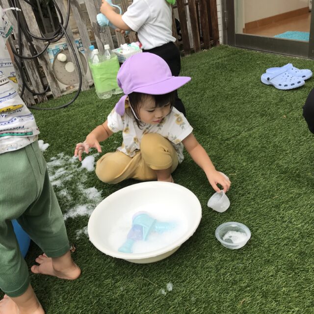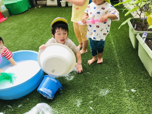 2025.08.12 保育園の日常、東葛西園 あわ! 水遊びで泡まみれになって遊んだよ~ よ~く泡立てて・・・・ おっと!顔にかかった! まだまだ泡立てていくよ~ 小分けにしましょ♬ いつもと違う水遊び。 楽しかったね~