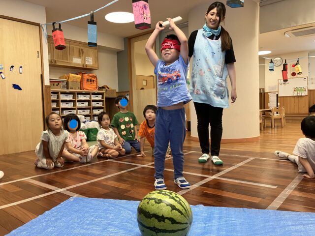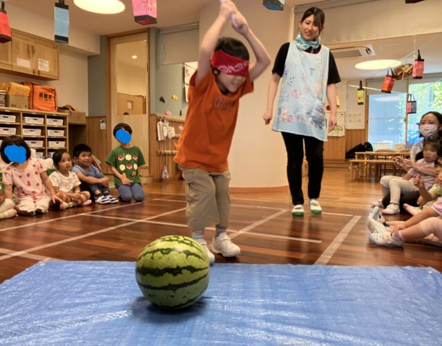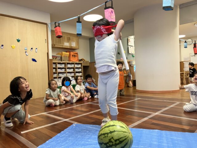 ここか!?(年中・年長クラスは、任意で目隠しに挑戦しています)