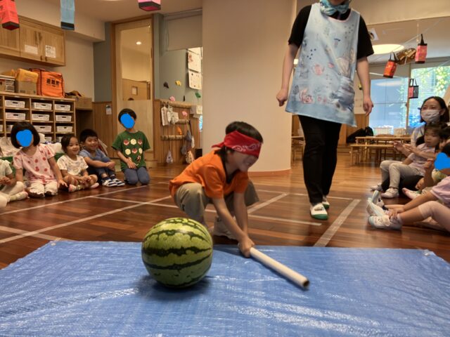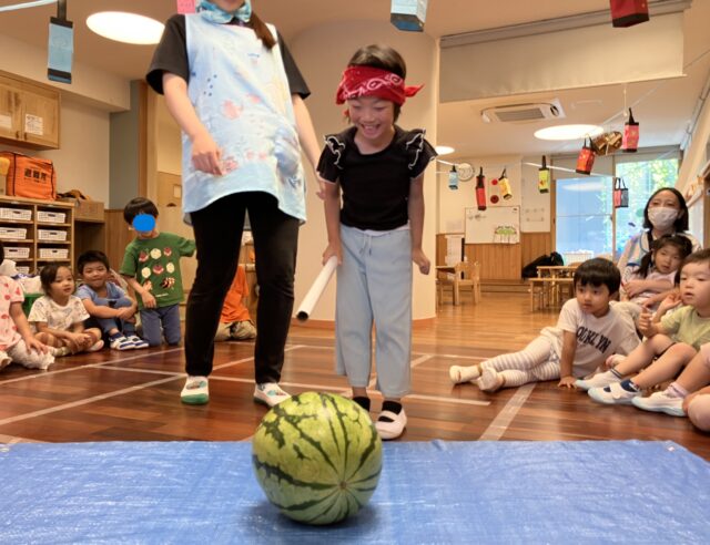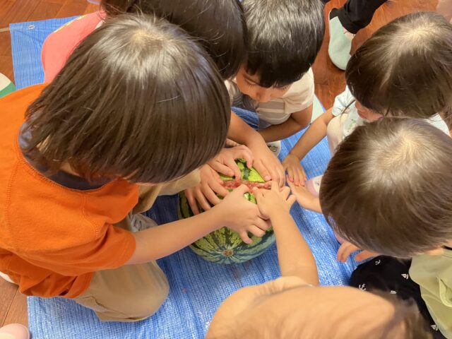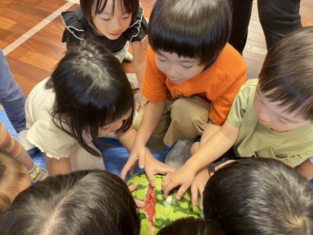 子どもたちはここぞとばかりに指を入れて、スイカを掘って?いました!!🍉