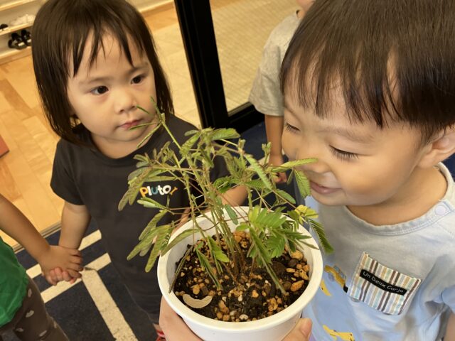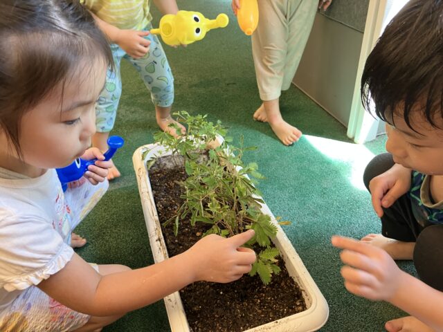 2025.08.29 保育園の日常、大岡山園 おおきくなーれ! 大岡山園3歳児クラスです。 オジギソウをプランターに植えかえ、みんなで観察! 匂いはする?触ったらどうなるのかな?など一つ一つ興味津々。 触ったら葉っぱが閉じてくことを発見!不思議に思いながらも「かわいい」「大きくなってね」と優しく声を掛けていました。水やりもしながら観察していこうね。