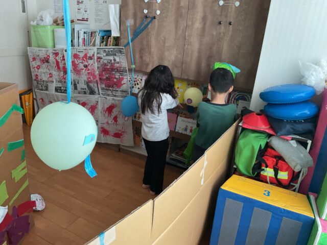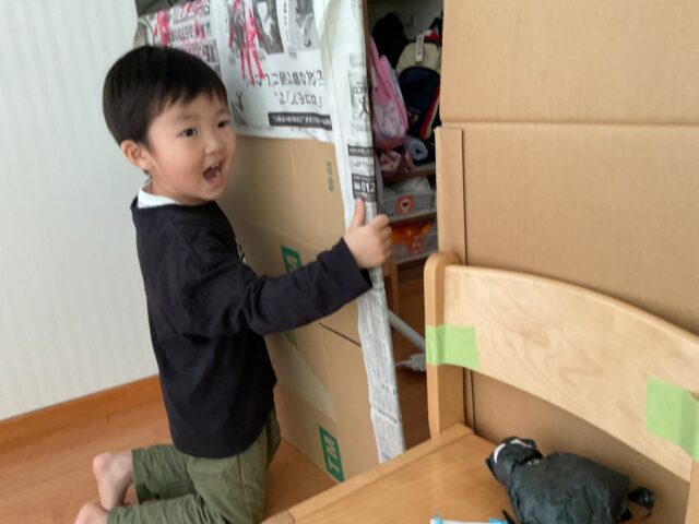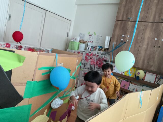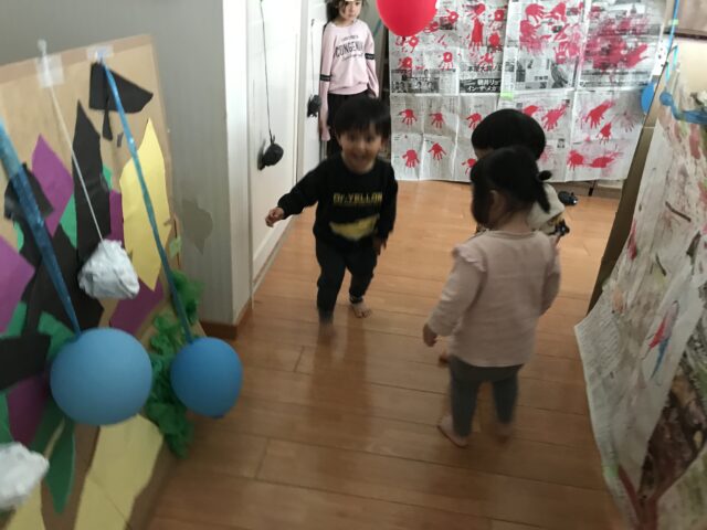 2026.04.2 保育園の日常、東葛西園 お化け屋敷迷路👻 完成したのは幼児クラスみんなで力を合わせた【お化け屋敷迷路】 他のクラスのお友だちや先生たちにも招待状が・・・ いざ!!! 裏側をチラリ どんな仕掛けが待っているのか・・・ あ・・・・ ドキドキしながら・・・ 首からお守りを下げてるから安心だ! きゃ~(゚д゚)!