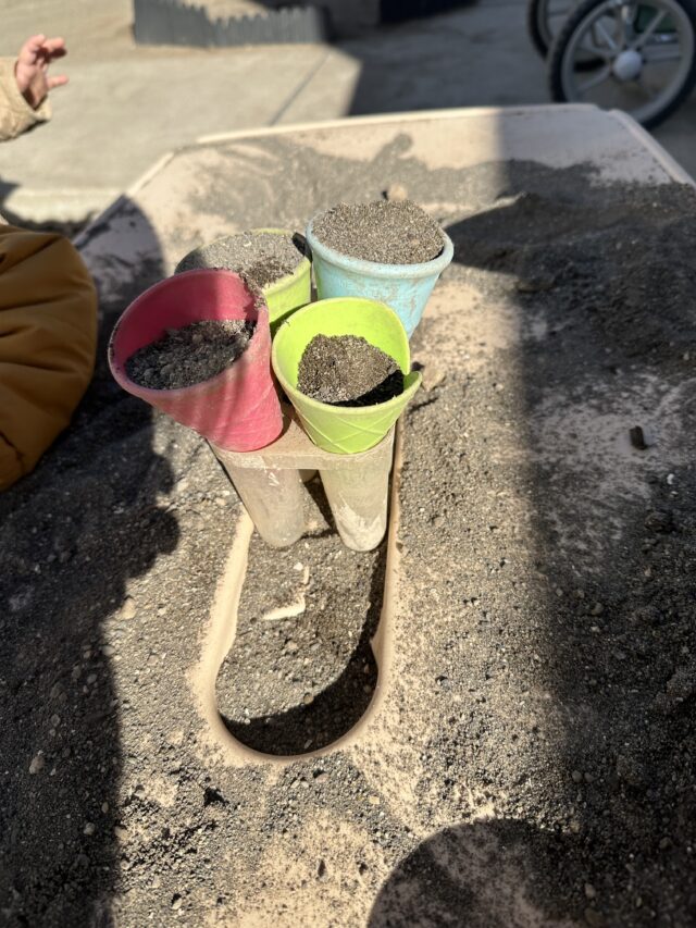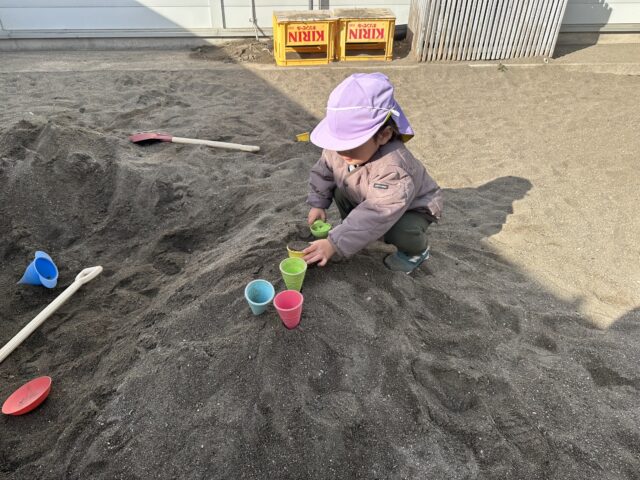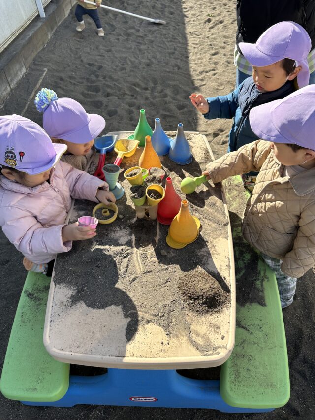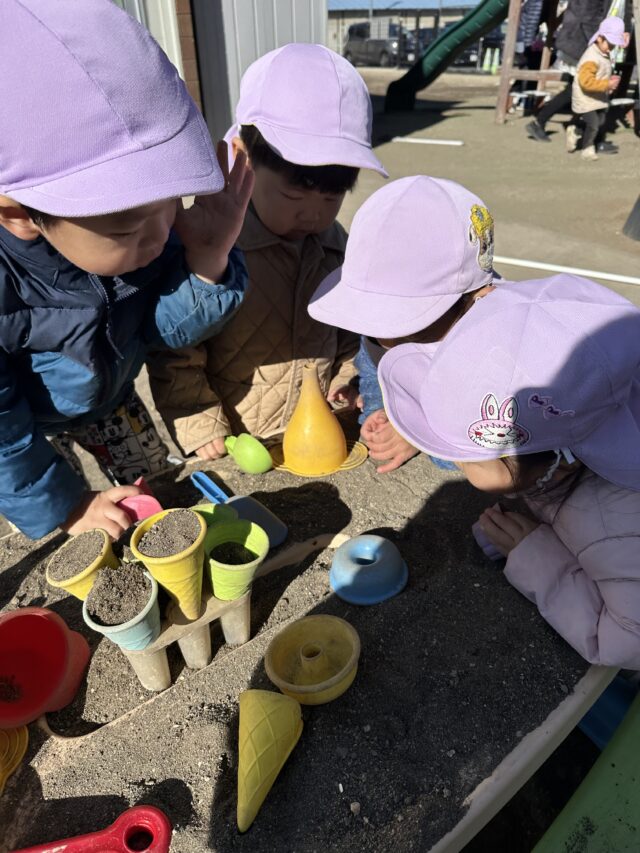 2026.01.18 保育園の日常、誉田保育園 お砂場遊びの様子♪2歳児♪ 今日は園庭遊びを紹介しますね♪ お砂場を覗いてみると・・・ アイス作りの真っ最中! できたアイスをテーブルへ!美味しそうなアイスクリーム屋さんになりました♪ 「いらっしゃいませ~!」「どれにしますか~!」かわいらしいアイス屋さん♡ 「あれ!?」と何かを発見!! みんなの視線の先には・・・ なんと虫さんでした♪ みんなのアイス屋さんに虫さんも来店!「え~虫さんもアイス食べるの~~!?」 お部屋に戻ってからもアイスの気分は止まらず・・・♡「これにするー!!」とアイス屋さんの絵本を見て楽しんだ子どもたちでした!