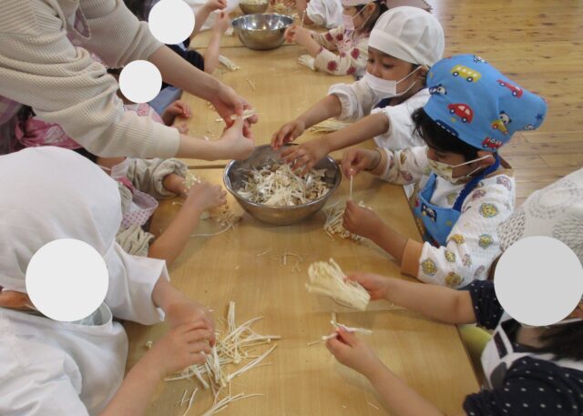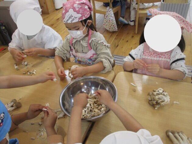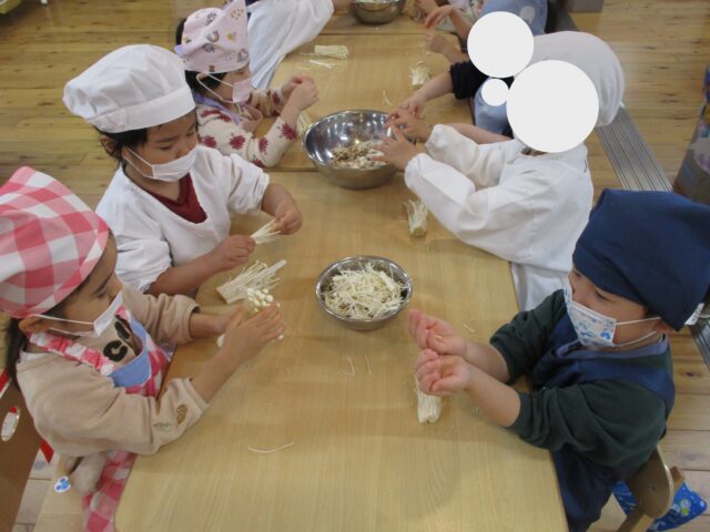 幼児クラスのみんなに、給食のお手伝いで”きのこさき”をしてもらいました。