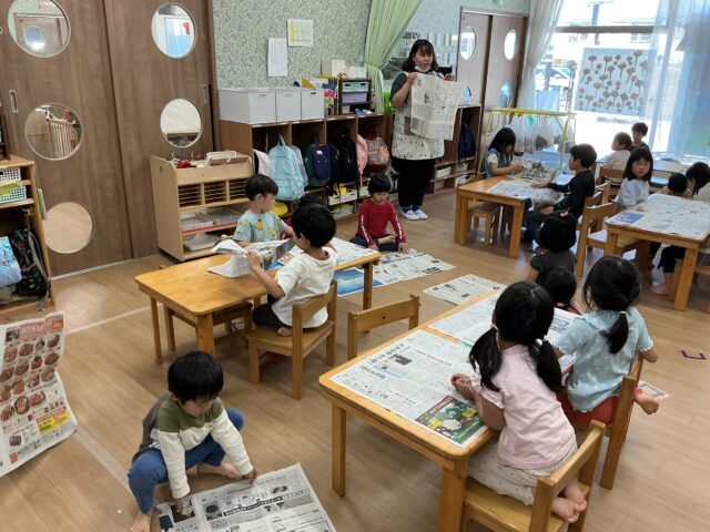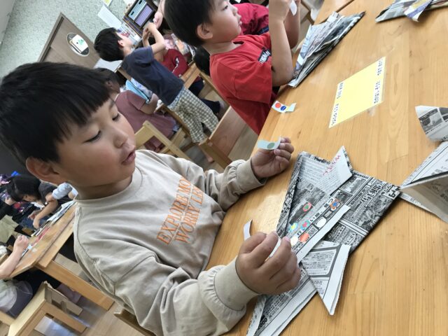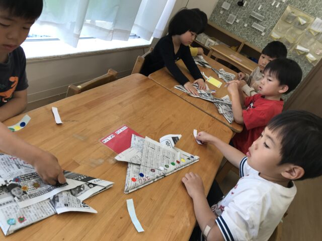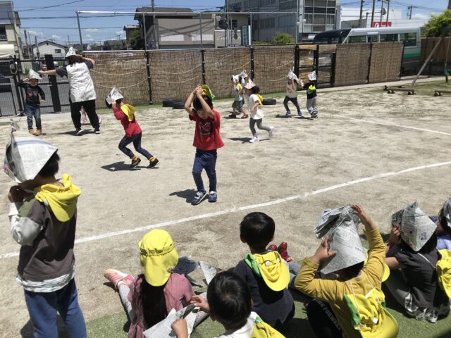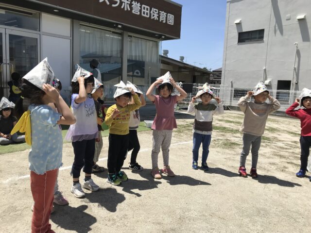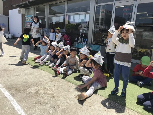 2025.05.12 保育園の日常、誉田保育園 こどもの日の集まり☆4.5歳児 クイズです。子どもの日に食べるものは何でしょう?? 新聞紙で兜を折ります シールも貼ってオリジナル兜の出来上がり シールのデコレーションも個性が出ますね~ 戸外で「かぶと取りゲーム」を始めます みんなで頑張るぞ~~ 兜を抑えながら追いかけて、攻撃タイプと守りタイプに分かれていました。