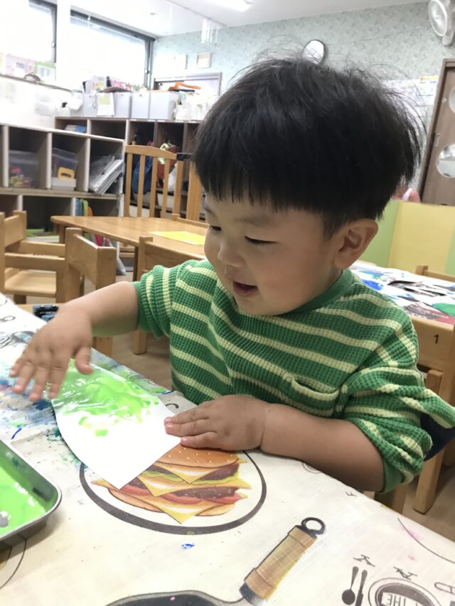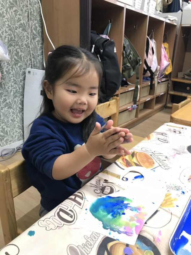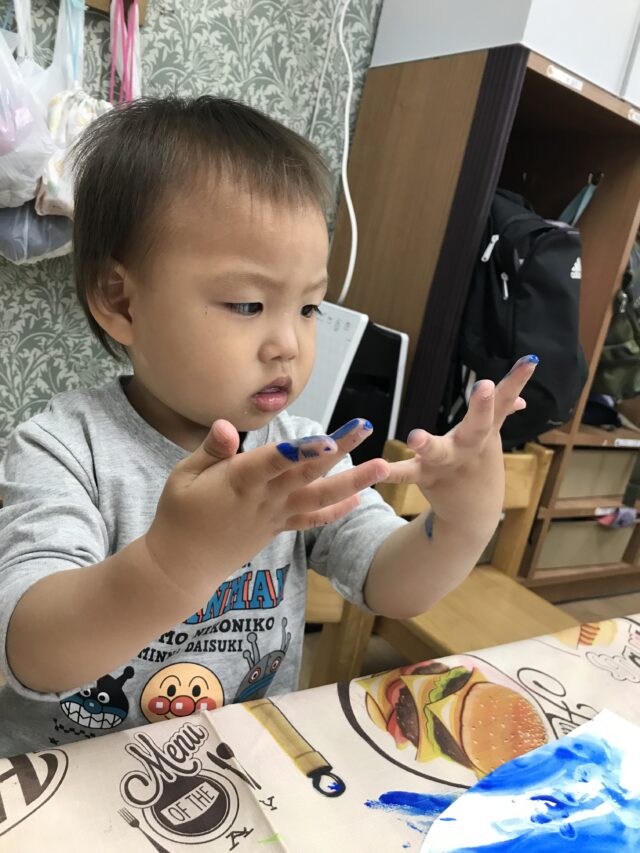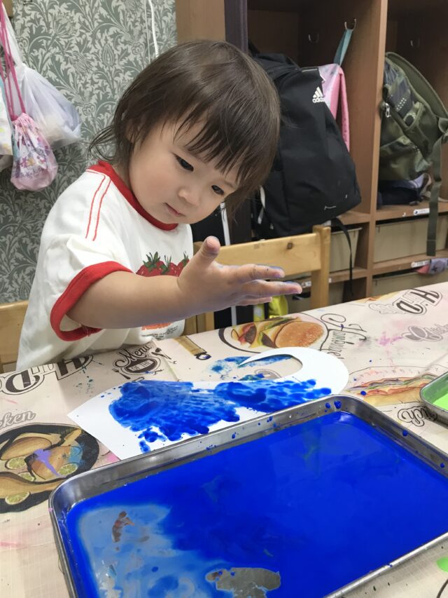 2025.05.31 保育園の日常、誉田保育園 しっぽとりゲームのしっぽを作ったよ☆2歳児 梅雨に向けて、室内で遊べる集団ゲームの準備を進めています。みんなで遊ぶ体験も楽しいことが沢山あるよ。 絵の具を手でペタペタ!!おもしろ~い 手が青だらけになっちゃった ペタペタが気持ちいい~~ この手どうしようかな~~???