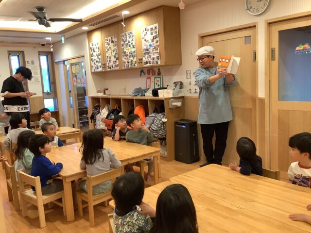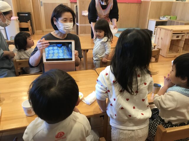 しろくまちゃんのほっとけーき🥞絵本を真剣に聞いています