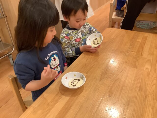 しろくまちゃんの顔のココアを指でなぞりペロリ😋と食べる子
