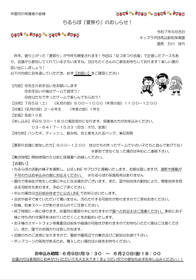 さて、今回は7月に行われる『夏祭り』のお知らせです!