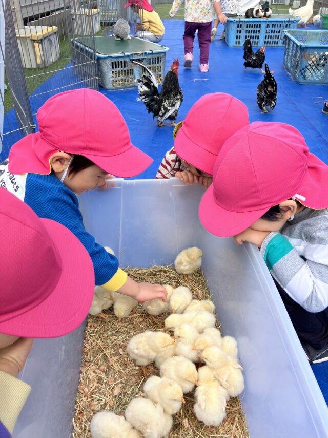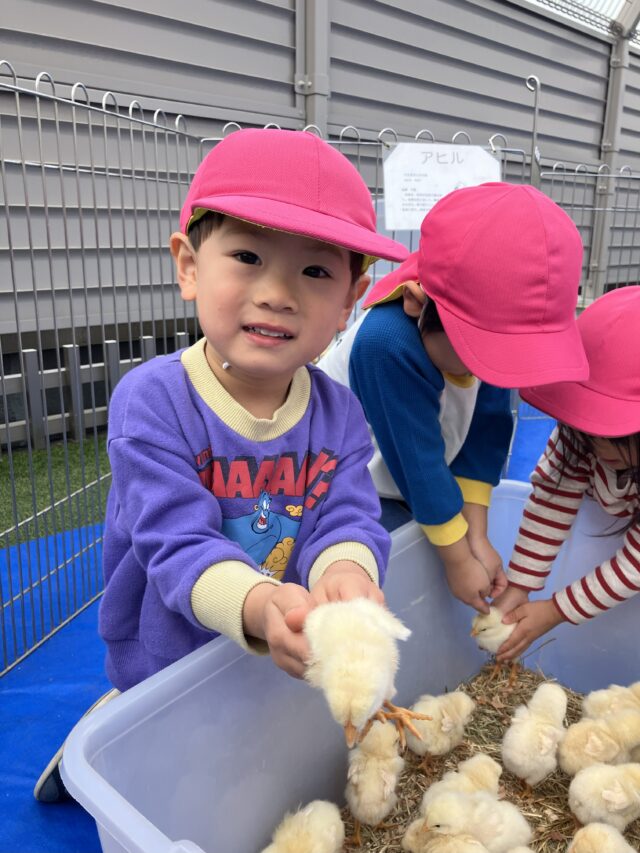 2025.12.2 保育園の日常、西馬込小規模保育園 どうやって触ろうかな 駅前園さんで移動動物園に参加してきました。 ポニーやヒヨコなど、いろいろな動物を間近で見ることができました。 ヒヨコさん可愛いね。触ってみたいけど少しドキドキ。 両手で優しく抱っこできたよ。