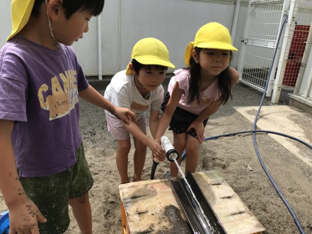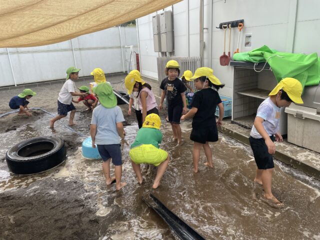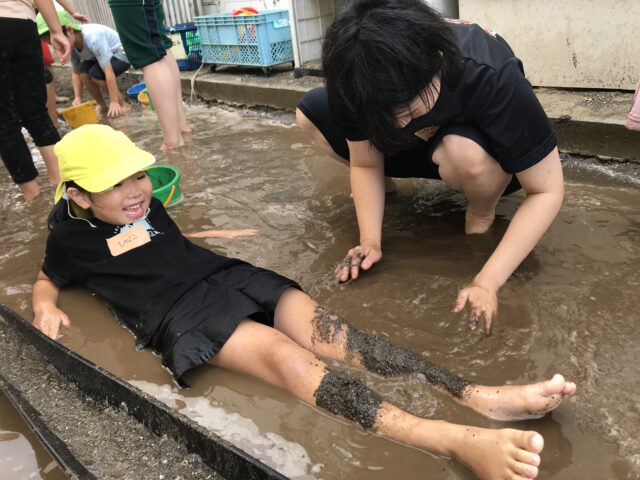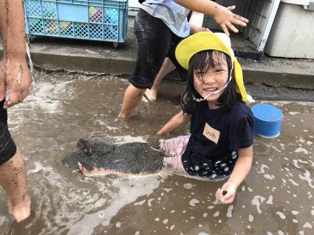 2025.09.15 保育園の日常、誉田保育園 どろんこ遊び☆4・5歳児 千石園のお友達が来園してくれました「一緒にどろんこ遊びしよう!!」 みんな大好きな、どろんこ遊びスタート!! 「水流すよ~~」どろ池つくろう!! 「泥パックはいかがですか?」お肌がすべすべになりますよ~ 穴掘って!!水溜めて!!どろ池の出来上がり どんどん泡が沢山になり、砂風呂のように。。。 みんな顔も体も泥だらけ、沢山遊んで満足感!!まだまだ暑い日が続いてるけど泥遊びを存分に楽しむことが出来ました
