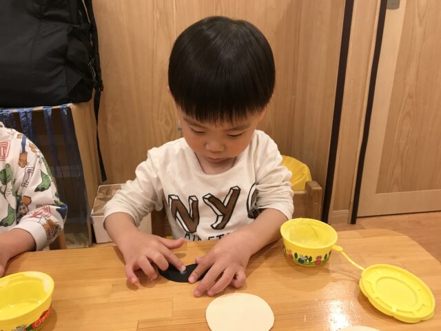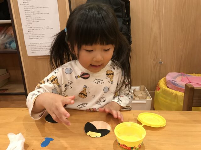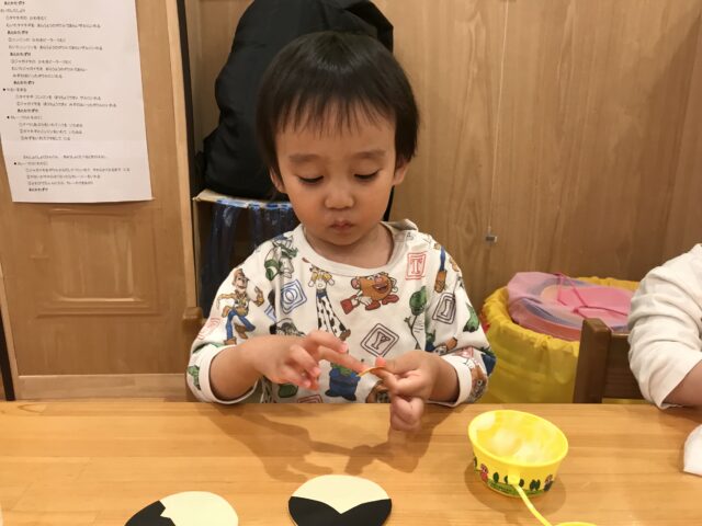 3/3はひな祭り。1歳のばなな組はひなあられ、2歳のりんご組はお雛様とお内裏様を製作しました。