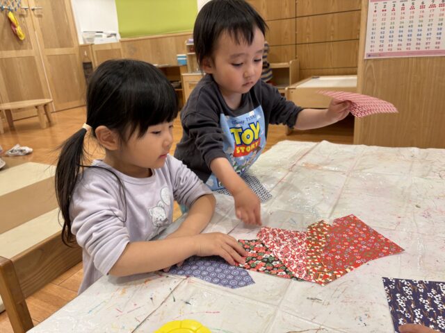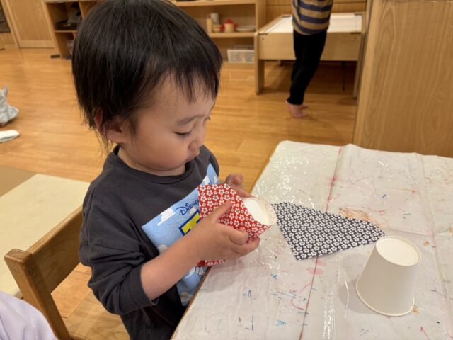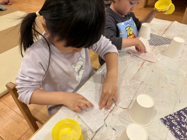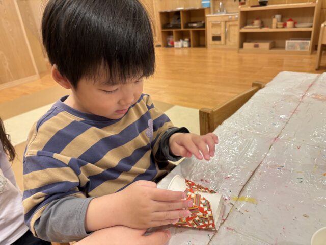 折り紙の柄は子どもたち自身で選び、紙コップに貼ってお雛様とお内裏様の体を作りました!