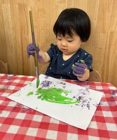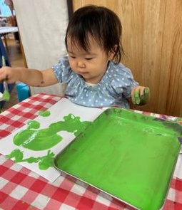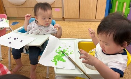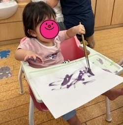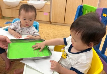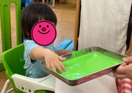2025.09.5 保育園の日常、菊名園 ひよこ組『えのぐあそび』 バッドの中のドロドロの液体に少々戸惑っていました💦 が、好奇心旺盛なひよこ組の子ども達。 初めは遠慮がちにツンツンしていましたが、どんどんダイナミックに! もっと!もっと! 私たちは筆使い!最高✨ 手が絵の具に染まってしまっても全くへっちゃら! あそびはまなび✨絵の具の感触を満喫していました😊💕