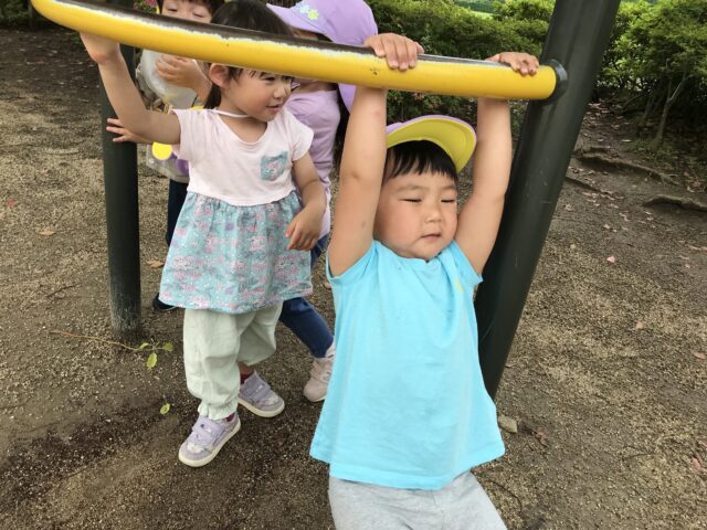 2025.06.8 保育園の日常、東葛西園 ぶらさがり!!! 腕力、使ってます! 少しずつ、ぶらさがる時間も長くなり逞しくなってきましたなぁ~ 遊具で遊ぶのも大好きだけど、からだを鍛えるのも大好き!?な、子どもたちです☆