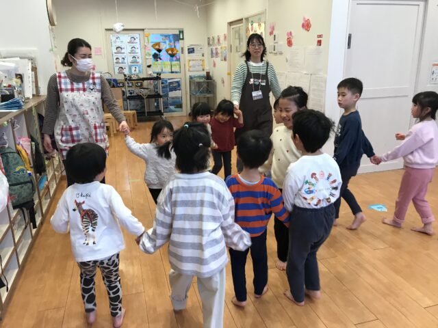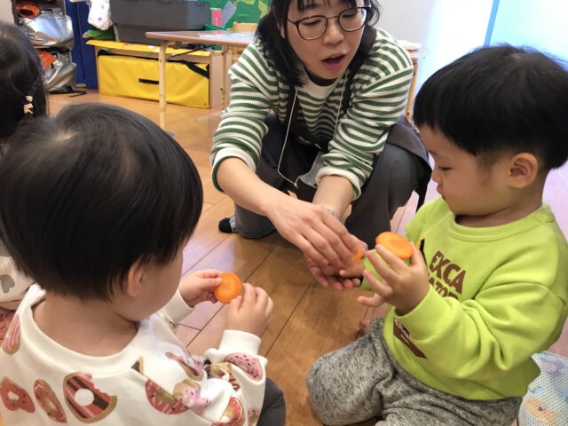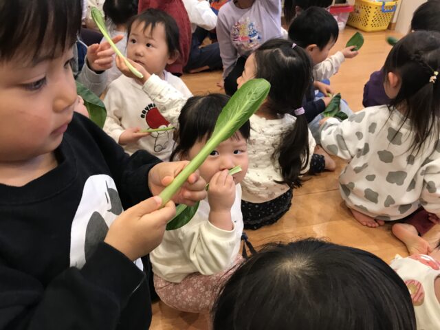 2026.03.24 保育園の日常、東葛西園 べジリンクさんがやってきた♬ 3月のとある日。この日の食育は・・・ べジリンクのまっちゃんが来てくれたよ~ いろんな野菜を触らせてもらったり、畑で野菜ができる様子を教えてもらったり 一緒に遊んでくれたよ~