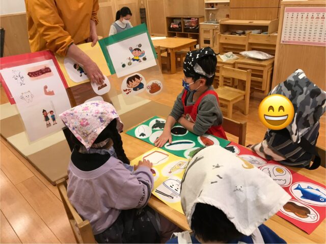 三色食品群が体にどう働きかけているのか考えたり、食材輪投げに挑戦したりしました。