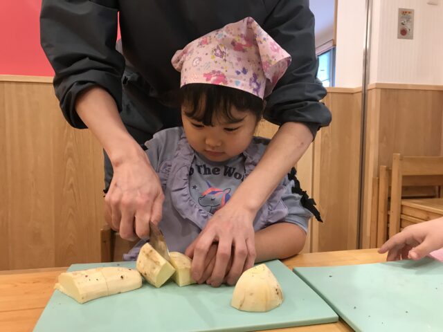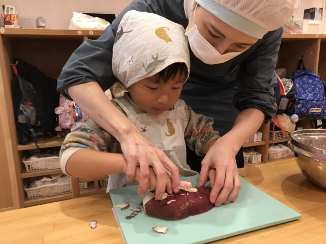 まずは、ぱいなっぷる組がさつまいもを洗い、ピーラーで皮剥きや包丁で小さく切ることに挑戦!