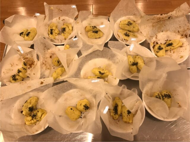 蒸したさつまいもに砂糖と豆乳を入れてビニール袋の中でよくこね、クッキングシートの上で丸めたり形を整えたりして完成!