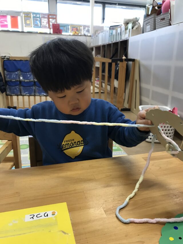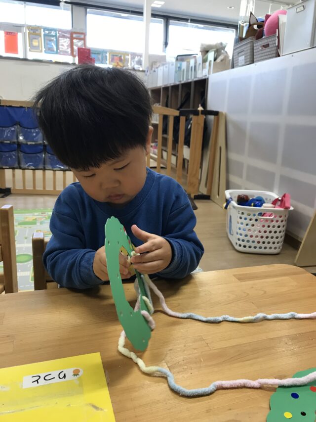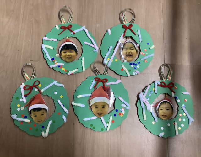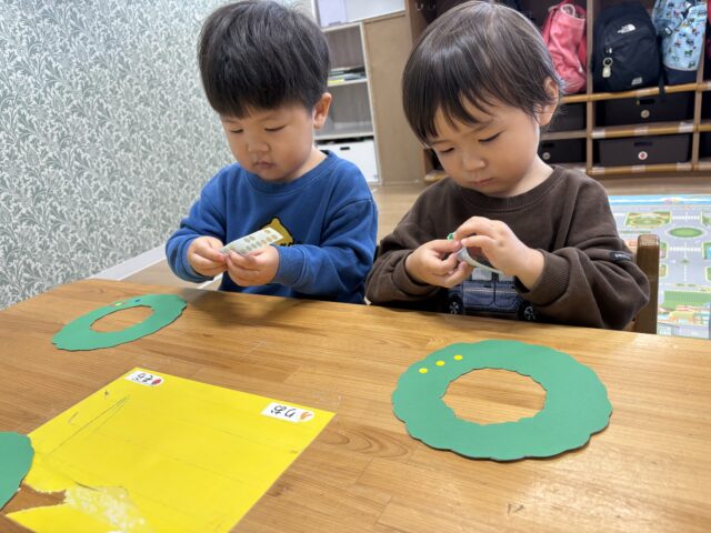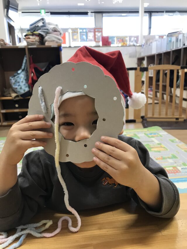 2025.12.13 保育園の日常、誉田保育園 クリスマスリース作り♪2歳児♪ もうすぐクリスマス!みんなでクリスマスリースを作ることにしたよ! まずはシールを貼ります! 「見て~貼れたよー♪」シール貼りは一人ひとり個性があって面白いね♪ 次は、ひも通しに挑戦♪ ひもを穴に通したら・・・ 「引っぱる~!!」上手にひもを引っぱれました♪ ひも通せた~! よいしょ♪ 真剣なまなざしです♪ またまた ひょっこり!「ひも遠しっておもしろーい!」 「ジャーン!」素敵なリースが完成しました!クリスマスが楽しみだね!