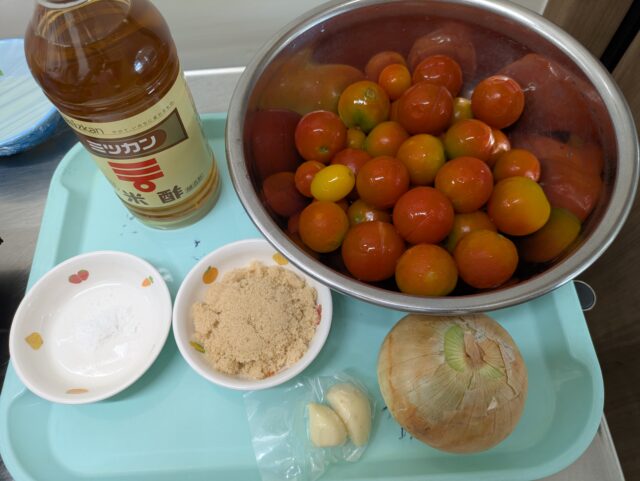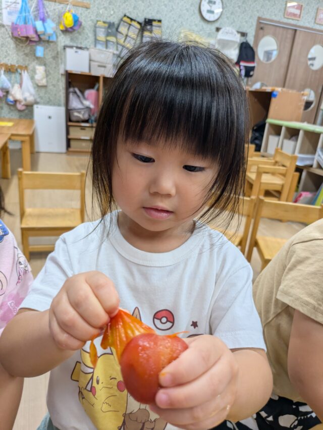 2025.08.31 保育園の日常、誉田保育園 ケチャップ作り☆給食室 ゆり組さんで畑で収穫した真っ赤なトマトを使って、ケチャップ作りに挑戦しました。材料はトマト、玉ねぎ、にんにく、塩、砂糖、酢です。美味しいケチャップに仕上がるかな? 給食の先生の話に興味津々!!「ケチャップって何で出来てるの?」「トマトをつぶすの??」 トマトの皮むきに挑戦!!「上手にむけたよ~」「お家でもやってみよう」 玉ねぎの皮むきにも挑戦!「なんだこの匂い~」「裸にすると白いんだね~」 材料をミキサーに入れて、撹拌します。どんな色になるかな?「赤になる~?緑になる~?」正解はピンク色でした。 次はフライパンで煮詰めてみます。「なんだか赤くなってきたよ~」「ケチャップの匂いがしてきた~」 畑で収穫したトマトが調理工程の中で形や色を変えながら、ケチャップに変身する様子に興味津々なゆり組さんでした