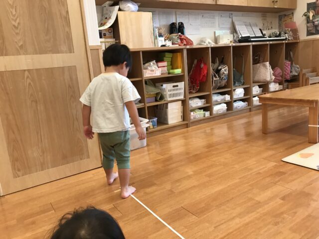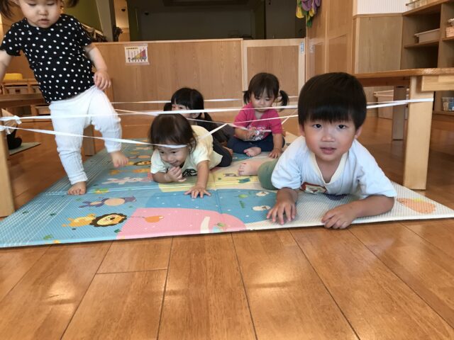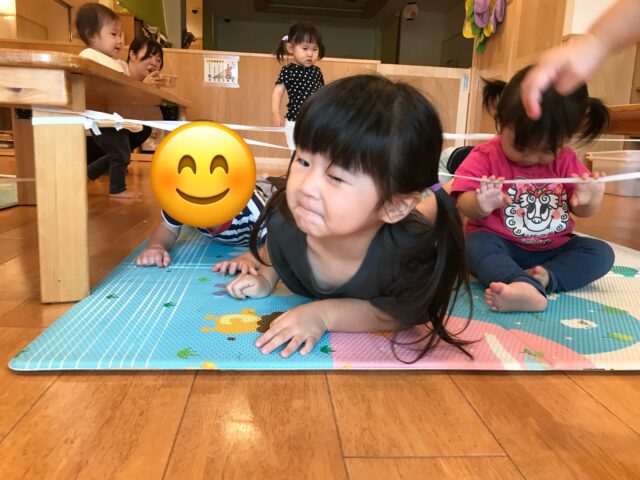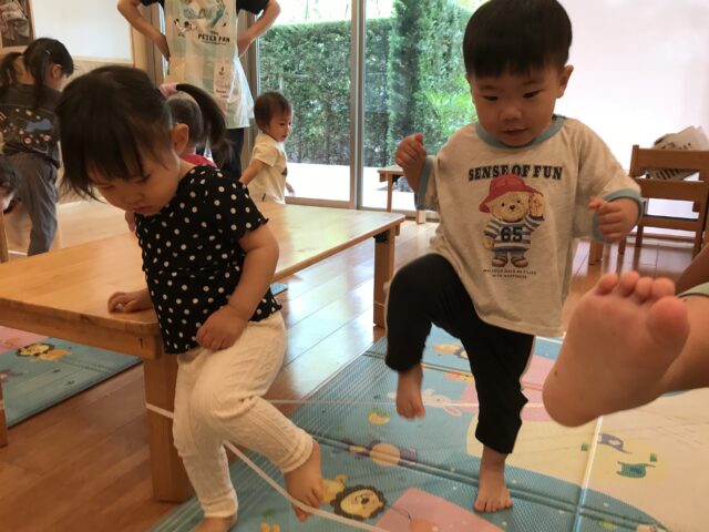 ゴムひもの下を潜ったりといろんな体の動かし方を楽しみました。2歳児のりんご組さんの中には両足をそろえて「ぴょん!」とジャンプする子もいましたよ!