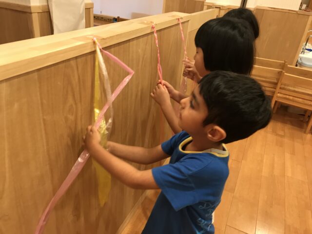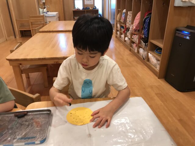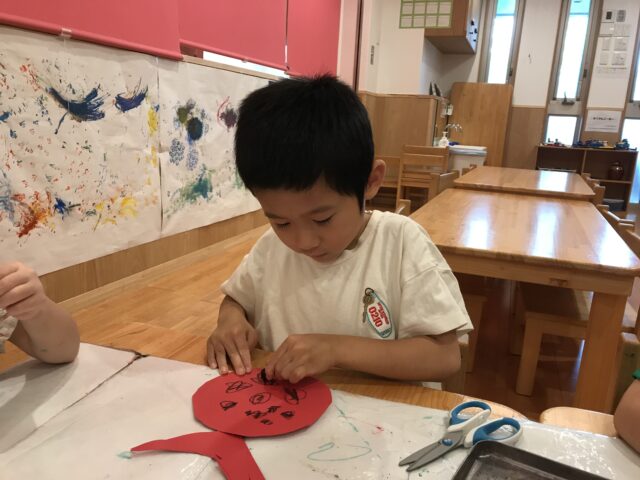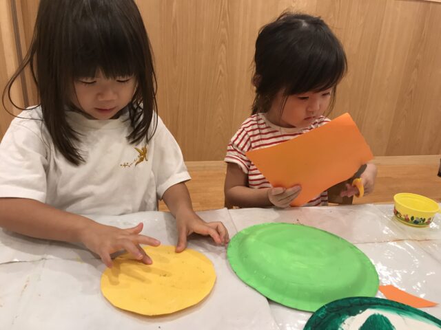 紙皿や画用紙を自由に選び、ハサミや糊、クレヨンや色鉛筆等を用いて作りました。
