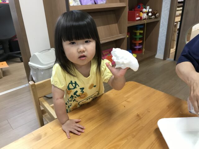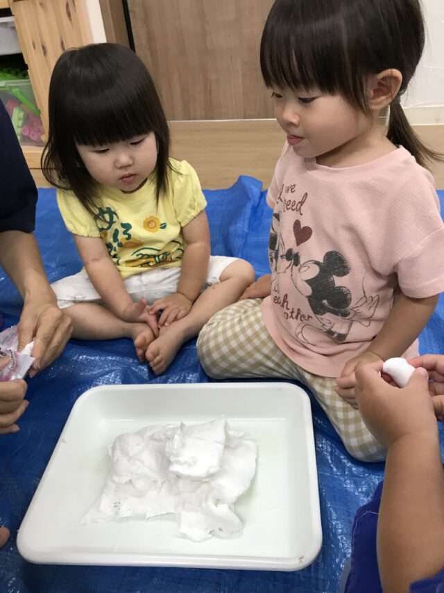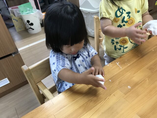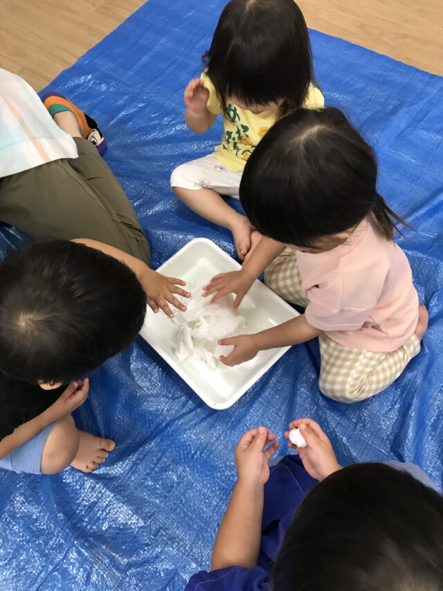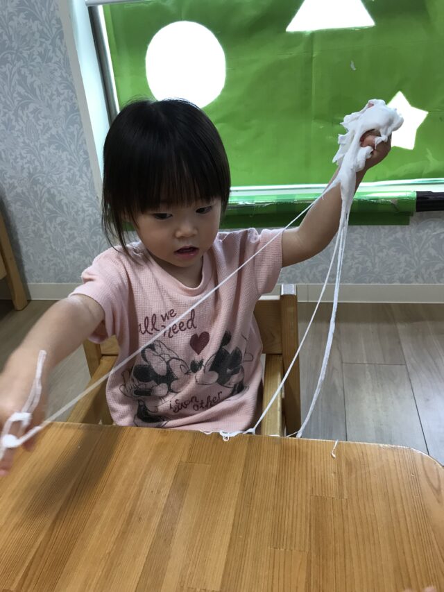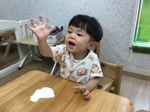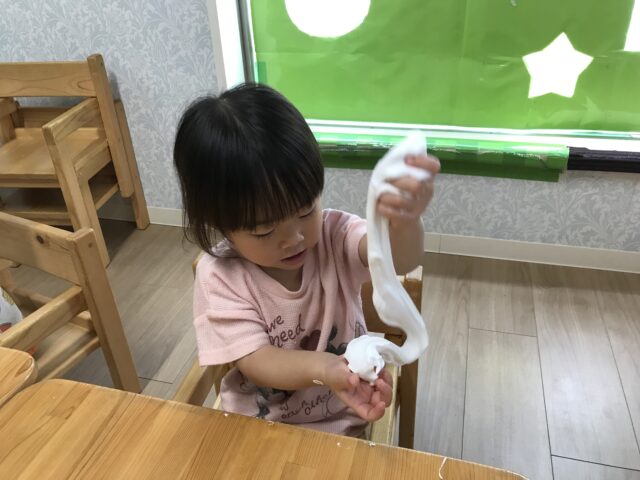 2025.09.6 保育園の日常、誉田保育園 スライム遊び☆1歳児 紙粘土スライムを作ってみよう!まずは袋の上から触ってみます。「やわらかい」「なんだこれ?」 「わたしにも触らせて」順番で触っています 袋から出してみたよ「これで何ができるのかな~?」 お水と重曹をいれて「まぜまぜ~」柔らかいね お椅子に座ってじっくり遊んでみよう!「何を作ろうかな~」 「みてみて!パンみたい」 「びろ~~ん」とよくのびます。 不思議な感触!! こねこね面白い~ずっと触っていたくなる不思議な感触でした。。 「おてても汚れないよ」「不思議!!」